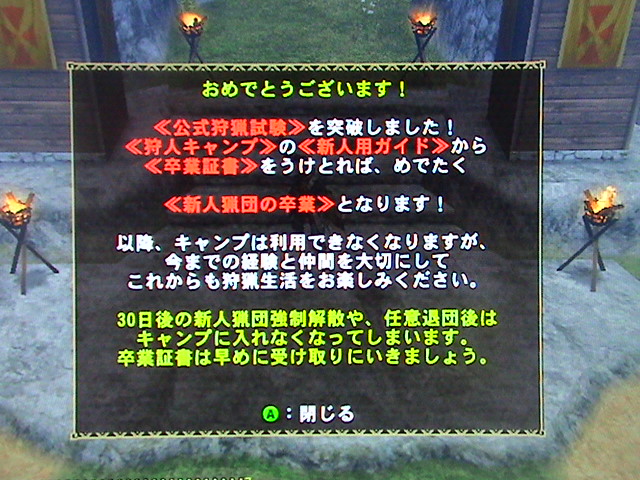 卒業証書を手にし、猟団キャンプと邪魔臭かった教官に別れを告げ、ようやく新米を卒業しました^^b