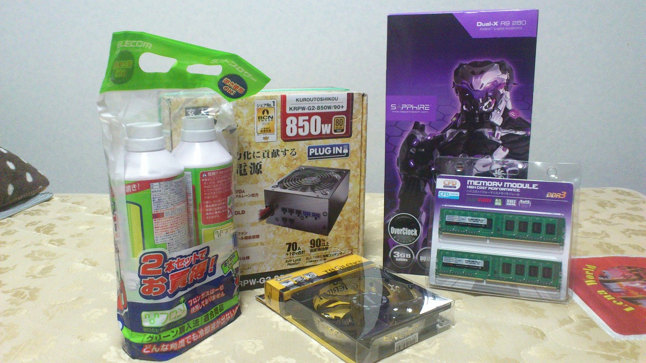 残りはスペックアップによってグラボの消費電力が上がってしまうため、850Wの電源と8Gメモリ、ファンとエアダスターを購入。
